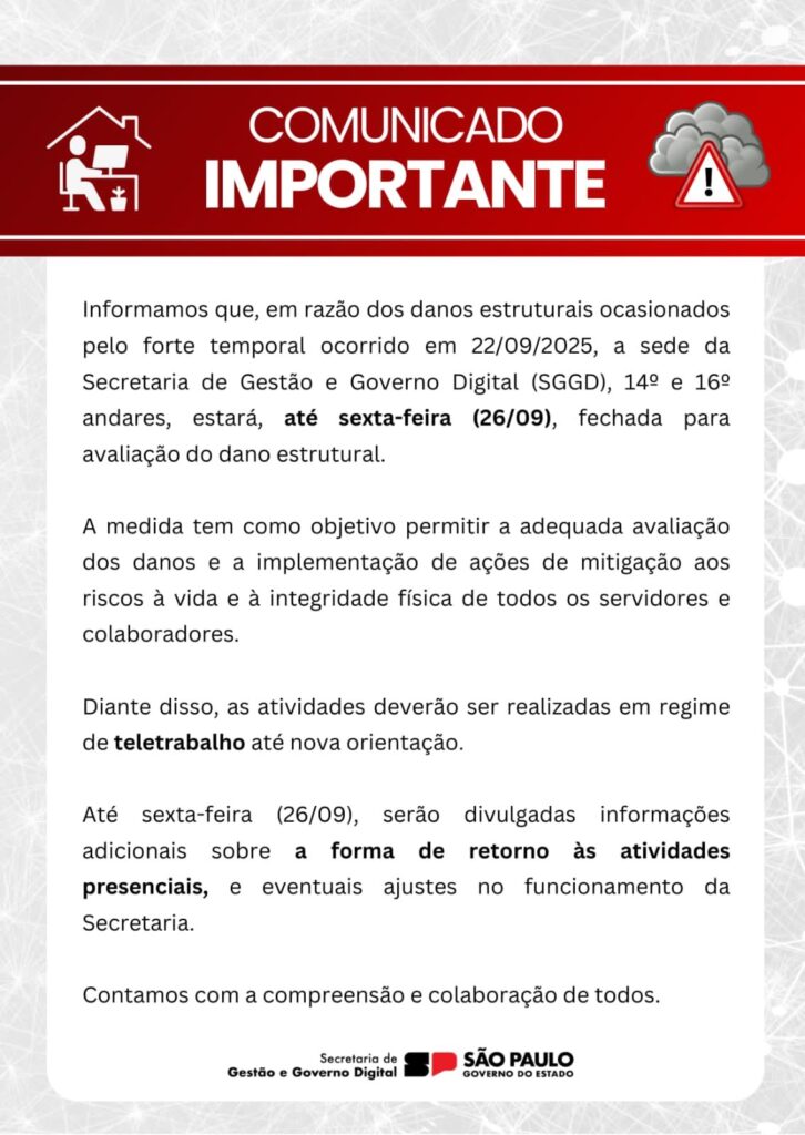 O próprio governo — sempre tão comedido — admitiu a gravidade da situação e determinou o fechamento dos andares superiores da secretaria. A justificativa? Risco estrutural agravado pelas chuvas. A solução? Mandar os servidores para casa em regime de home office… até segunda ordem (ou até o teto cair de vez).