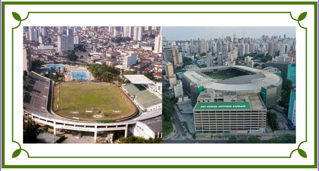 A moldura com a foto do Parque Antártica, o famoso jardim suspenso, e a foto do Allianz Parque, a fantástica arena do verdão